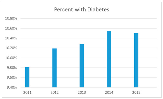 The prevalence of reported diabetes for adults remained relatively stable across all years under study at 9.8% for 2011 and 10.5% for 2015, representing less than a 1% increase. There were also slight increases in the percentage with diabetes among several groups (e.g., adults with lower incomes, those who were age 65 years or older, those with who did not graduate from high school). Previous research has shown in other parts of the globe (e.g., the United Kingdom) that those in more deprived areas are more likely to be exposed to risk factors associated with diabetes [23]. Thus, relative to large increases in the rate of diabetes in the 20 years preceding 2014 (growing from 4.2 to 10%) [4], rates in the past 5 years may be plateauing to an extent, albeit still increasing slightly.