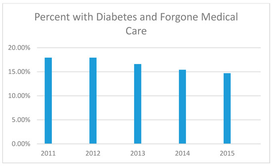Forgone medical care due to cost (e.g., not seeking medical care that was thought to be needed due to cost barriers) among those with diagnosed diabetes was the second primary outcome of interest in the current study. The sample size was reduced when sub-setting only to those with diabetes for analyses of forgone medical care (unweighted sample size: 2011, n = 62,461; 2012, n = 59,763; 2013, n = 62,345; 2014, n = 61,118; 2015, n = 57,256). The survey item included, “Was there a time in the past 12 months when you needed to see a doctor but could not because of cost?” We subset those reporting having diabetes and who responded to this question. Thus, analyses of forgone care (yes/no) includes only those with a diagnosis of diabetes (i.e., diabetes = yes). Dependent Variable 2: Among the subset to only those saying “Yes” to having been diagnosed with diabetes, y = Yes (i.e., Yes, there was a time in the past 12 months when I needed to see a doctor but could not because of cost) versus No (i.e., No, there was not a time in the past 12 months when I needed to see a doctor but could not because of cost).