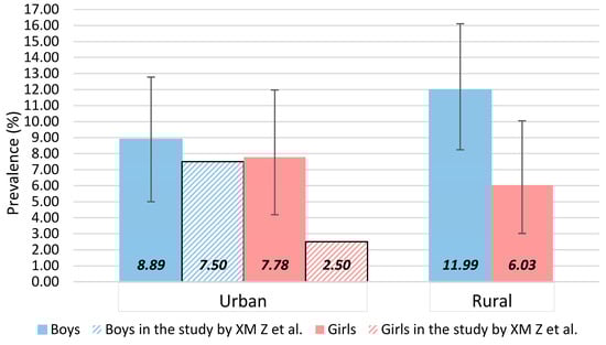 A total of 75 children were classified as having suspected NAFLD, among whom 49 were boys and 26 were girls; 29 came from urban areas, while 44 came from rural areas. An overall prevalence of 9.03% (95% CI: 7.22–11.31) was yielded. The prevalence was 10.75% (95% CI: 8.11–13.60) in boys, and 6.93% (95% CI: 4.53–9.60) in girls. In urban children, the prevalence was 8.36% (95% CI: 5.48–11.24), and in rural children, the prevalence was 9.44% (95% CI: 6.87–12.02). The gender- and residence-specific prevalence of childhood suspected NAFLD is shown in Figure 1. The prevalence of suspected NAFLD was higher in our study than that in the study by XM Zhang et al. in both boys and girls [], especially for urban girls, the prevalence of suspected NAFLD in our study was more than three-fold that in the study by XM Zhang et al. (7.78% vs. 2.50%) [].