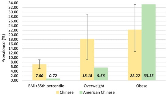 In different BMI categories, the prevalence varied (Figure 2). The prevalence of suspected NAFLD was 7.00% (95% CI: 5.22–9.09) in children with BMI < 85th percentile, 18.18% (95% CI: 9.09–29.09) in overweight children and 22.22% (95% CI: 12.70–33.33) in obese children. The comparison of the prevalence of suspected NAFLD between Chinese and American Chinese is also presented in Figure 2 according to different BMI categories, the estimates of suspected NAFLD in these two populations were both based on the ALT threshold of >22.1 IU/L for girls and >25.8 IU/L for boys []. Overall, Chinese children had a higher prevalence of suspected NAFLD than American Chinese children (9.03% vs. 6.14%). The prevalence of suspected NAFLD was much higher in Chinese children with normal weight and overweight children (7.00% vs. 0.72% and 18.18% vs. 5.56%, respectively), whereas the prevalence of suspected NAFLD in obese children was higher in American Chinese than in Chinese (33.33% vs. 22.22%).