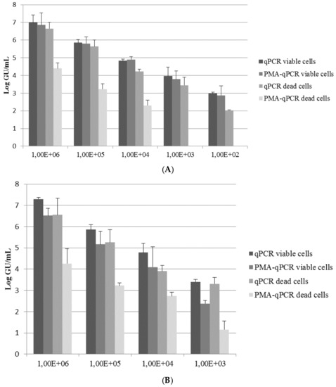 The results using Exposure Protocol A were obtained with qPCR on viable and heat-killed cells (with and without PMA) are reported in Figure 2A.