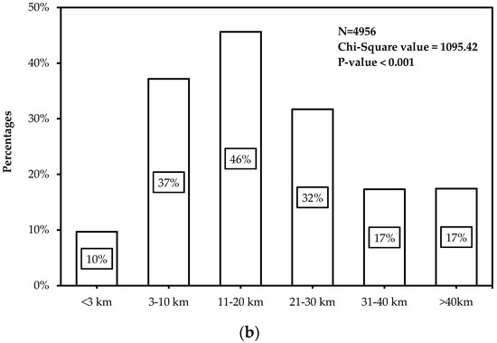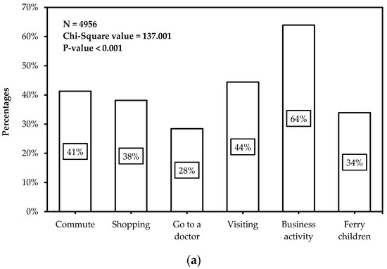 Figure 1 shows the distribution of participants’ carsharing mode choices under different trip purposes and different trip distances. In Figure 1a, it could be found that, among the six trip purposes, business activities occupied the highest choosing proportion of carsharing mode, followed by visiting friends and relatives, commuting, shopping, drop-off and pick-up of children, and finally go to the doctor. Specifically, participants’ choosing rate ranges from a minimum of 28.5% to a maximum of 64%. In Figure 1b, 377 participants showed willingness to use carsharing mode when the trip distance was 11–20 km, accounting for the highest proportion, 46%. The results revealed that other relatively competitive trip distance intervals of carsharing mode included 3–10 km and 21–30 km, the choice rate of which were both higher than 30%. When the trip distance was within the other three intervals, <3 km, 31–40 km and >40 km, carsharing mode was not attractive to participants.