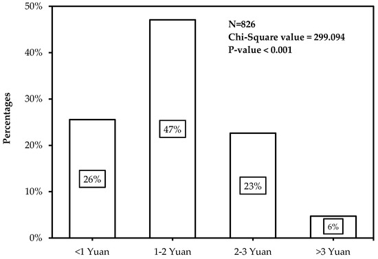 Figure 2 displays the distribution of participants’ highest acceptable price to use carsharing. It should be stated here that the cost in this paper was calculated by minutes. Results obviously revealed that most of participants (47.1%) could accept the price between 1 and 2 Yuan. In total, 25.5% of participants insisted that only when the price was less than 1 Yuan they would consider using carsharing; 22.6% of participants could accept the price between 2 and 3 Yuan; and only 39 participants (4.7%) would be willing to pay more than 3 Yuan.