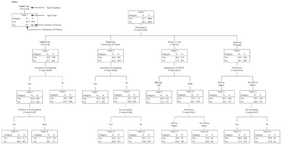 As shown in Figure 4, the tree could be classified as follows. In the first level of the tree, the participants’ carsharing mode choice behavior (Node 0) was divided into four child nodes (Node 1–4) according to different trip purposes. In the second level, Node 1 and Node 2 were both divided into two child nodes (Node 5–8) by participants’ awareness of carsharing; Node 3 was divided into two child nodes (Node 9–10) by participants’ satisfaction on UPTSL; and Node 4 was divided into two child nodes (Node 11–12) by participants’ profession. In the third level, Node 5 was divided into two child nodes (Node 13–14) by children in the household; Node 8 and Node 12 were both divided into two child nodes (Node 15–16 and Node 19–20, respectively) by car ownership; and Node 10 was divided into two child nodes (Node 17–18) by participants’ profession. The detailed characteristics could be identified as follows.