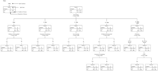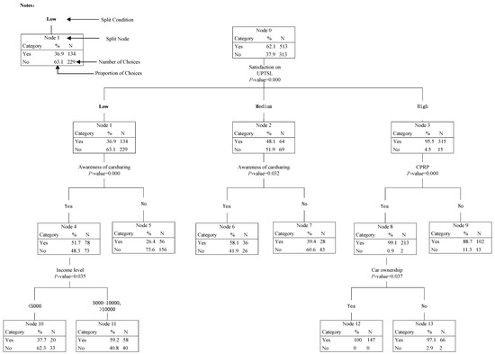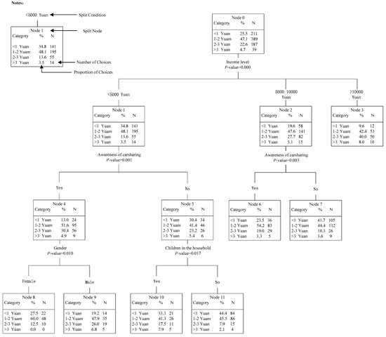 In this study, there were three dependent variables, including participants’ carsharing mode choice, highest acceptable price to use carsharing, and willingness to forgo car purchases. Moreover, independent variables were multi-categorical nominal variables. Therefore, HTBR method is quite suited for exploring the influencing relationships between independent and dependent variables. The HTBR analyses in this study were carried out using the IBM SPSS 22.0 software package (IBM, North Castle, NY, USA). The specifications for tree construction include: CHAID algorithm was applied; the maximum tree depth was set as 3 levels; and the significance values for splitting nodes and merging categories were set as 0.05. The minimum number of cases for parent nodes was set as 100 and the minimum number of cases for child nodes was set as 50.