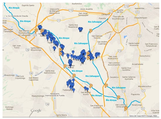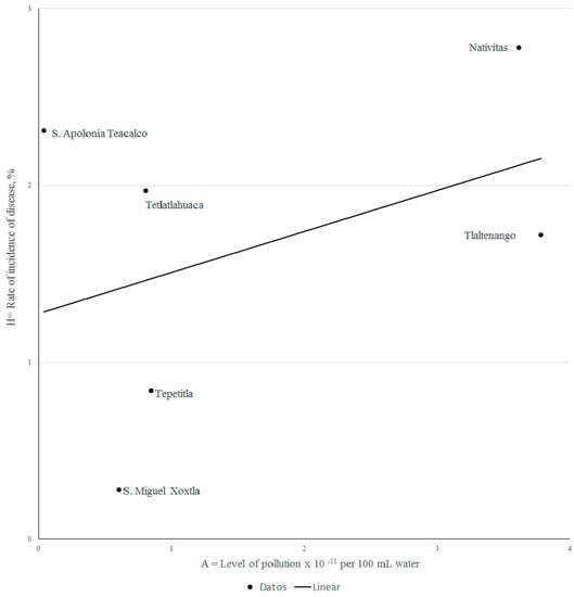 The 169 cases are marked with purple symbols in Figure 2, which shows the pattern of distribution of diseases, which is clearly distributed along the Atoyac and Zahuapan rivers []. The distance between the river and the occurrence of disease is 1.5–3.0 km. This preliminary approach suggests a causal relationship between water contamination and gastrointestinal disease.