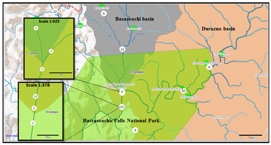 Bassaseachic Falls National Park geographical area. The numbered circles indicate the sampling sites. Source: INEGI digital map, Cartographic Package 2010; Scale 1:41062. Samples 5 (28°10′47.45″ N, 108°12′45.49″ W) and 6 (28°12′40.80″ N, 108°13′20.49″ W) during June were missing, while sample 13 during March was also missing (28_10127.36″ N, 108_12144.97″ W). See Supplementary Materials Table S1 for sampling site names.