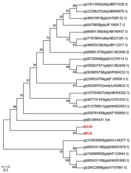 The RV and NV positive samples were sequenced and analyzed to determine differences with those reported worldwide. Phylogenetic trees were produced for both viruses, using neighbor joining with the Kimura method and a G value of 1.73. The sequence names were NO26 for October and NP24 for June, with these sequences being compared with previous sequences reported in the GenBank. Those sequences were chosen for their relationship with the RdPd gene, as they had a similarity (about 80% identity) to a strain from Japan, the USA and Italy. The result confirms that the detected NV in both cases belonged to genogroup II. This genogroup is distributed worldwide and is associated with diarrheic outbreaks []. Nevertheless, it differs from the previously reported Mexican NV sequence (EU884431) (Figure 2), thus indicating the need of genotype studies to obtain accurate phenotype information.