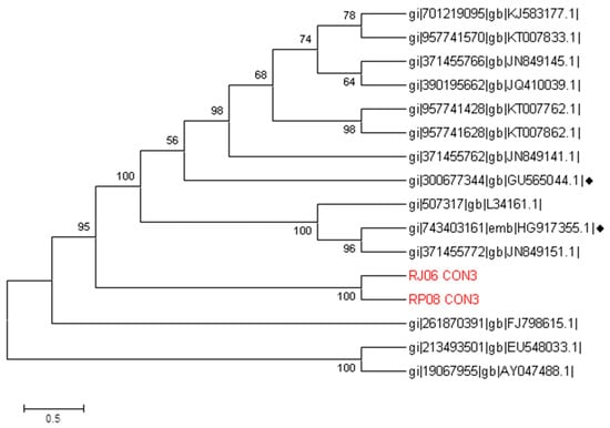 Phylogenetic tree constructed with a region of the four genes from rotavirus with different strains around the world. This was inferred by neighbor joining. Our sequences RP08 and RJ06 are highlighted along with the vaccine sequences, which are marked by the ♦ symbol. The evolutionary distances were computed using the Kimura 2 method with G value of 1.73. The bootstrap consensus tree inferred from 1000 replicates is taken to represent the evolutionary history of the analyzed taxa. There was a total of 490 positions in the final dataset. Evolutionary analyses were conducted using the software MEGA6.