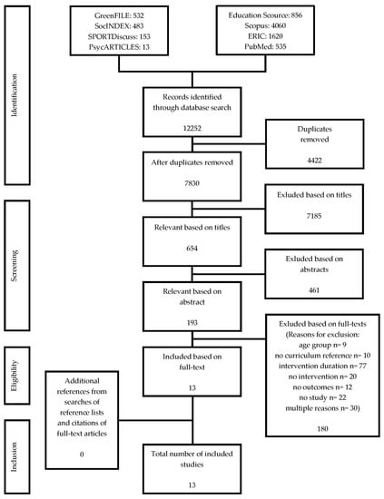 Table 1 shows the main descriptive characteristics of the 13 included studies. Table 2 shows specific information concerning the interventions and data collections. Four studies were conducted in Denmark [4,6,7,27], three in the USA [28,29,30], and one each in Germany [23], New Zealand [31], Sweden [5], the UK [32], and Norway [33]. One study included data from the UK, India and Kenya [34]. The sample sizes varied considerably across the studies, from five [6] to 230 [5] children/adolescents being involved. Nine studies are defined as case studies [4,6,7,27,29,31,32,33,34], three studies used a quasi-experimental design [5,28,30], and one study used a cross-sectional design [23]. Three publications [4,6,7] are based on the same intervention, while all other publications are based on individual interventions. Six studies collected and analysed data on a solely student level [4,23,27,29,34,35], five studies also included data from teachers, staff and parents [6,30,31,32,33] and one study [5] only included data from parents. Eight studies used interviews [6,27,29,30,31,32,33,34], six studies used questionnaires [5,7,28,30,31], three studies used learning assessments [29,30,31], two studies used observations [32,34] and, in each case, one study used a postal survey [23], written documents [29], drawings and concept maps [34], and accelerometry [4]. The quantity of compulsory educational activities in a natural or cultural environment outside the classroom varied from one school day bi-weekly to a duration of eight weeks [27], and a six-month full week programme [23]. The chosen environments also differ between the studies: gardening projects on school grounds or nearby community properties [27,32,34], classes in a local forest [4,6,7,31,33], prairie [30] and farmland areas [29], the use of nearby school environments [5,28], and an overseas sailing expedition [23].
