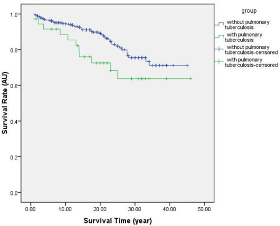 Survival curves of Coal Workers’ Pneumoconiosis (CWP) patients with or without pulmonary tuberculosis.