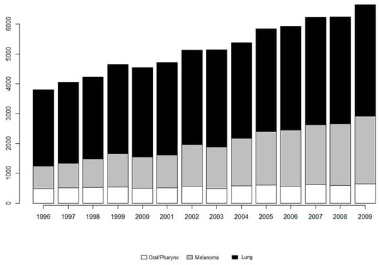 Following the imputation, the expected rate of disease () is calculated. The subsequent statistics and figures are based on the imputed dataset. Figure 1 displays a histogram of incidences per study year segmented by disease. From this, it is easy to see that the incidences of melanoma and lung are increasing over time while oral/pharynx remains steady. This could be part of why the previous multivariate model did not perform well in the later study years. For the 7718 diagnosed cases of oral/pharynx in South Carolina for these study years, there are approximately 168 (range: 19–651) cases per county per year leading to a rate of disease equal to 0.0001. Similarly, there were 20,156 and 44,595 diagnosed cases of melanoma and lung with an average of 438 (range: 25–2726) and 969 (range: 115–3885) cases per county per year leading to rates of disease equal to 0.0003 and 0.0008, respectively. These rates of disease are calculated as the total incidence over the entire study time divided by the total population at risk over the entire study time.
