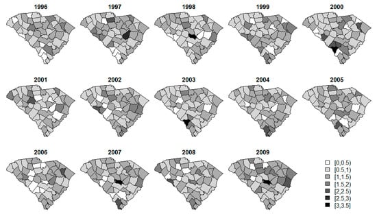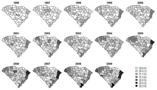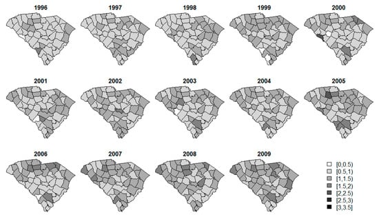 As far as interpretation is concerned, these models do offer some difficulties. For the best model, Alt2B, the ideal interpretation of the random component comes from the information provided in the term: . This estimate represents the total of the confounding adjusted for in the fitted model and is displayed in Supplemental Figure 4. From this estimate, it is clear that the overall risk unexplained by the fixed effects becomes more variable over the study period. Increased risk appears in the northwestern and northeastern corners of the state; these areas are in the mountains and along the coast respectively. Interpretation of the fixed effects is similar in that the measure of interest would be for the particular county and disease of interest. Beyond that, an interpretation of the mixture parameter can be ascertained wherein, for example, if a particular county in Alt2B has and , then 10% of the overall variability in the risk is explained by spatial effects, 50% is explained by temporal effects, and 40% is explained by ST effects. If the entire state and all diseases have a fairly low estimate for one of the mixture parameters, as with Alt1U for oral/pharynx, it might be of interest to fit the model without that component to determine if it is necessary for explaining the overall variability in the risk of disease.