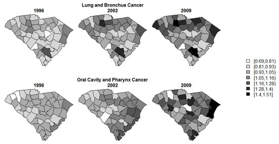 Since our goal is, ultimately, to improve the modeling of risk related to oral/pharynx cancer, Figure 5 displays the overall risk () of lung and oral/pharynx associated with the best model, Alt2B. The fixed effect parameter estimates used for this calculation are included in Supplemental Table S4. Only 1996, 2002, and 2009 are included for brevity. From this figure, it can be deduced that lung has high risk in the northern portion of the state, as well as a lone county of elevated risk in the southern tip. For oral/pharynx cancer, the overall risk is higher in the eastern counties, particularly for some along the borders. This could be some edge effect which occurs in models of this nature. Temporally, the risk for both diseases appears to be increasing slightly over the years represented. In general, the trend in risk appears to be consistent across both space and time.