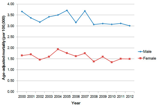 Temporal trend of age-adjusted mortality of bladder cancer in Taiwan, 2000–2012 (Performs chi-squared test for trend in proportions).