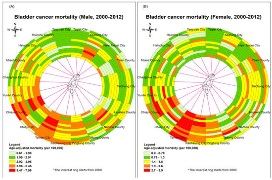 Spatio-temporal distribution of bladder cancer age-adjusted mortality rates with ring map in city or county level during 2000–2012. (A) Male (B) Female.