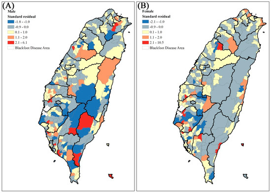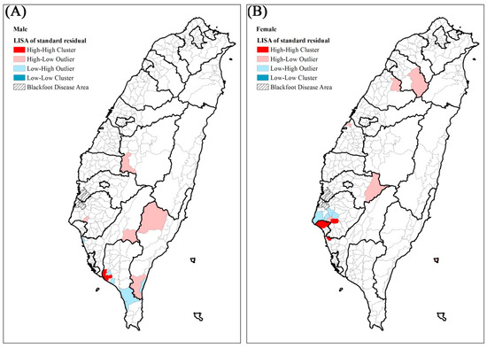The residual maps after GWR (adjusted for all the above variables) are shown in Figure 3. They indicate that the standard residual in many townships remained larger than 2. Thus, we used local Moran’s I to identify the local high-high clusters of residuals. For both males and females (Figure 4), the high-high clusters were all in southern Taiwan, including Kaohsiung City and Tainan City.