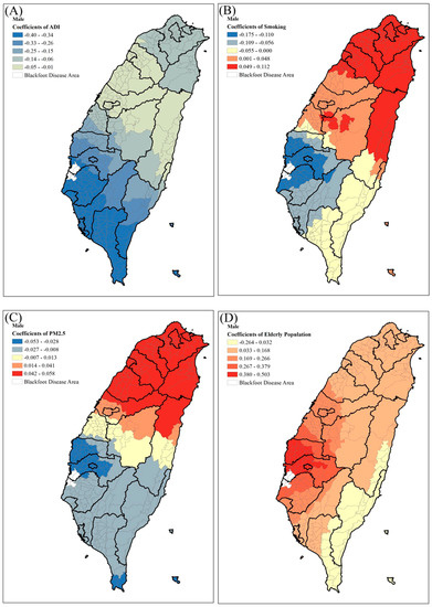 In accordance with previous studies, this study has found that elderly male subjects were more prone to develop bladder cancer than females. Aside from age and sex, there are several other risk factors for bladder cancer, including smoking, industrial exposure, certain medicines or herbal dietary supplements, arsenic in drinking water, lack of fluids intake, etc. [35]. Among the risk factors analyzed in this study, the smoking rates of both sexes were positively correlated with bladder cancer mortality. However, the spatial effects of smoking rate were different. In males, the effect in northern Taiwan was higher, but in females, the effect in southern Taiwan was higher. In the results of one meta-analysis [36], cigarette smoking had a higher probability of inducing a more malignant type of urothelial carcinoma and an increased risk of dying due to bladder cancer.