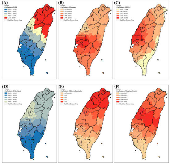 In order to show the effects of the significant risk factors for the mortality rates of bladder cancer, we displayed the spatial distribution of four significant predictors of bladder cancer mortality in males (Figure 5). In males, the smoking rate and PM2.5 both had higher positive correlations with bladder cancer mortality in northern Taiwan; although the area deprivation index showed negative correlation with bladder cancer mortality, especially in southern Taiwan. However, the population of elderly males showed positive correlation with bladder cancer mortality, especially in central and southern Taiwan. In females (Figure 6), smoking rate, PM2.5, health care facilities density, and the population of elderly all showed positive correlations with bladder cancer mortality; area deprivation index showed a positive effect only in northern Taiwan, while the percentage of female aborigines showed a negative effect throughout all of Taiwan.