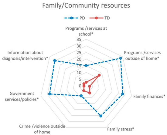 Percentage of parents who perceived barriers in each item of the subscale of Family/Community resources in the PD and TD groups. Abbreviation: PD, physical disabilities; TD, typical development; NOTE: Bonferroni adjustment of the significance level set at * p < 0.002.