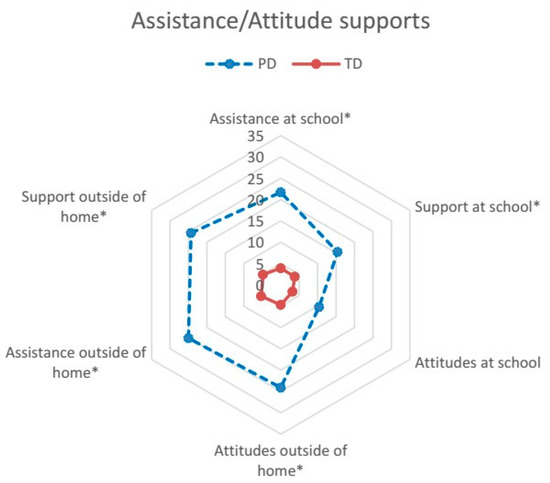 Percentage of parents who perceived barriers in each item of the subscale of Assistance/Attitude supports in the PD and TD groups. Abbreviation: PD, physical disabilities; TD, typical development. NOTE: Bonferroni adjustment of the significance level set at * p < 0.002.