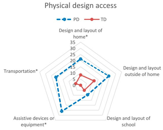 Percentage of parents who perceived barriers in each item of the subscale of Physical design access in the PD and TD groups. Abbreviation: PD, physical disabilities; TD, typical development. NOTE: Bonferroni adjustment of the significance level set at * p < 0.002.