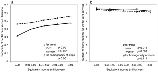Significant positive linear trends existed, indicating that the subjects with lower income were less likely to use dental care services, for both sexes (p < 0.001) (Figure 1a). In addition, the gradients were steeper in men than in women (p < 0.001). The probability of the utilization (95% confidence interval (CI)) estimated by GEE (generalized estimating equation) in the lowest and highest income groups were 0.316 (0.308–0.324) and 0.476 (0.465–0.486) in men and 0.462 (0.454–0.469) and 0.561 (0.551–0.572) in women, respectively. However, a significant inverse association between the income and number of days required for dental services for both men (p = 0.013) and women (p < 0.001) (Figure 1b) was observed. The tests for the homogeneity of the slope between men and women were not significant (p = 0.717). Mean number of days (95% CI) estimated by GEE for the lowest and highest income groups were 6.49 (6.31–6.66) and 6.20 (6.05–6.36) for men and 6.42 (6.30–6.54) and 6.10 (5.95–6.25) days for women, respectively. Coefficients estimated by GEE for the association of equivalent income with the utilization of dental care services and the number of days for which dental services were required are shown in Table S1.