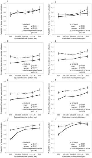 Probability of all dental care utilization predicted using the generalized estimating equation for each age group based on equivalent income category from 1 April 2014 to 31 March 2015. (a) 0–8 years (n = 7320); (b) 9–16 years (n = 9075); (c) 17–29 years (n = 16,893); (d) 30–39 years (n = 18,907); (e) 40–49 years (n = 26,434); (f) 50–59 years (n = 21,285); (g) 60–69 years (n = 67,344); (h) 70–74 years (n = 48,953). Solid lines represent men and dotted lines represent women. Estimated probabilities and 95% confidence intervals are shown. Sex, equivalent income, residential area, number of family members, and the interaction between sex and equivalent income were included in the models. p-values for the linear trends for equivalent income categories for each sex were calculated. p-values for the test of the homogeneity of slope, in which null hypothesis was that there was no difference in the linear trend coefficients for the equivalent income categories between men and women, were also calculated.