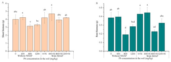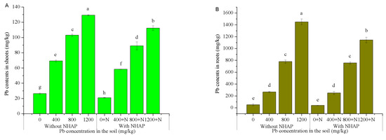Effects of NHAP on Pb contents in shoots (A) and roots (B). a–h: The different letters in the figure represent significant differences between treatments at p < 0.05.
