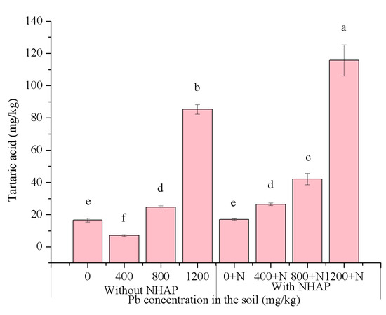 Organic acids are widely present in plants and in the rhizosphere environment [30]. Under environmental stresses, such as heavy metals, organic acids secreted by plants were found to be significantly increased [31]. In this study, the low molecular weight organic acids in rhizosphere soil were measured after harvest at day 30. Tartaric acid was detected in perennial ryegrass rhizosphere soil, while other organic acids were below the limits of detection. As shown in Figure 4, tartaric acid content increased significantly along with the increase in Pb content in the soil. The tartaric acid contents were significantly positively correlated to the soil Pb contents in all treatments. This showed that secretion of tartaric acid by ryegrass was sensitive to Pb stress. The application of NHAP caused an increase in tartaric acid content by an average of 98.82% compared with the treatments without the addition of NHAP. The probable cause for this was that NHAP administration promoted the growth of ryegrass. It has been reported that plant root secretion of organic acids can improve the mobility and bioavailability of heavy metals in soil [32,33]. The increase of tartaric acid content also increased the likelihood that ryegrass absorbed Pb from rhizosphere soil. The objective of NHAP application was to lower the bioavailability of Pb, which seemed to be inconsistent with the role of tartaric acid. It has been reported that low molecular weight organic acids, including acetic acid, malic acid, citric acid, and oxalic acid, promoted the adsorption of Pb2+ on the surface of NHAP [34]. Therefore, the increase in tartaric acid could be considered as a beneficial aspect of NHAP for plant growth and reducing the bioavailabiliy of Pb. Tartaric acid had no inhibition effect on the remediation results of NHAP.