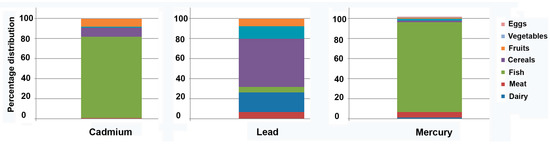 33], the major dietary sources of cadmium are cereals and fish; these conclusions corroborate our results. Similar results were found for the intake of mercury: fish was the major dietary contributor. Cereals made the greatest contribution to total dietary lead intake in three of the four areas studied; this result supports our observation about the contribution of cereals to the dietary intake of lead in the current sample. A previous study also showed that cereals are a major source of dietary lead and cadmium in Spain [