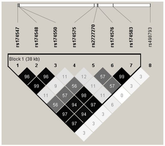 Linkage disequilibrium (LD) block generated by the 8 FADS1 and FADS2 polymorphisms genotyped, with pairwise r2 values and color scheme.