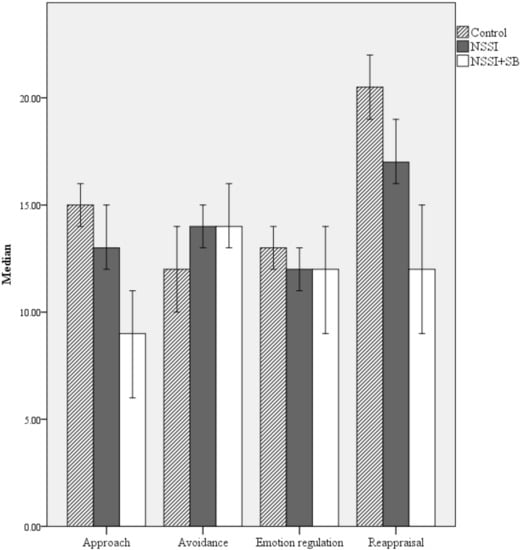 IQR = 8.00] respectively) and reappraisal coping: Control > NSSI > NSSI + SB (