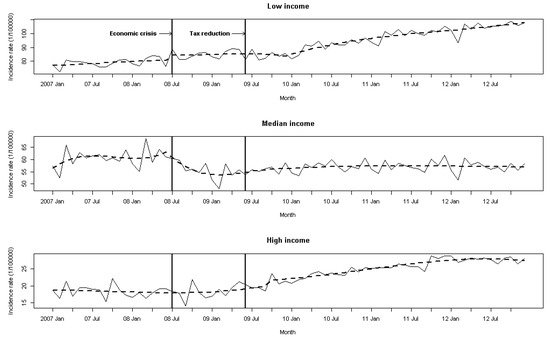 The Low/Middle income groups showed significant (p < 0.05) changes in the AIRH for AADs after the economic intervention. Results from the interrupted time-series analysis are presented in Table 2. In the low income group, the permanent model indicated an upward trend after the two interventions, which differed from the trend in the pre-intervention period that was noted in subsequent years. The AIRH for AADs showed a 7.11% increase in July 2008 compared to the 12-month pre-intervention period and a 39.74% increase by December 2009. On the other hand, the analysis for the middle income group indicated a significant 22.9% decline in the AIRH that began in July 2008 and was subsequently sustained for the next ten months. The tax reduction significantly raised the AIRH for AADs for the high income group, with a permanent increase of 47.69% in the rate occurring in September 2009.