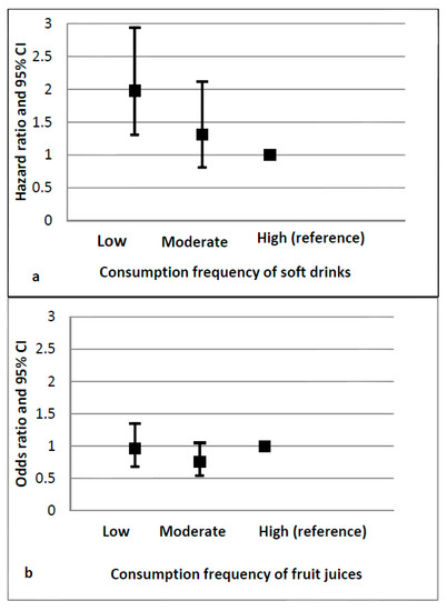 Figure 1 illustrates that the lower the frequency of sugary beverages consumption, the higher the odds for a child to consume water in high frequency. However, only the low frequency of soft drinks intake—and not the moderate one—was significantly associated with high water consumption frequency (Figure 1a). The frequency of fruit juices consumption was not associated with the one regarding water (Figure 1b). The education level of the mother and the country did not significantly modify the aforementioned associations, but they proved to be confounders.