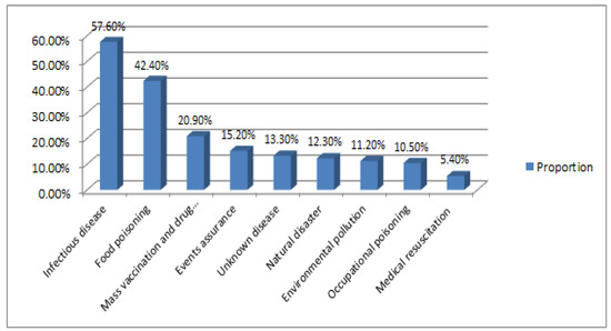 Overall, the risk assessment work in public health emergencies in CDCs was not carried out well. Most of the respondents (62.7%) did not participate in any risk assessment work. As shown in Figure 1, of 705 respondents who had ever undertaken risk assessment, 57.6% was related to infectious disease risks and 42.4% was related to food poisoning risks. Mass vaccination and drug response-related risk assessment accounted for 20.9%. The remaining proportions of assessment covered public health risks arising from events assurance, unknown disease, natural disaster, environmental pollution, and occupational poisoning were less than 20%. Medical resuscitation-related risk assessment was at the lowest proportion (5.4%).