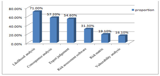 42.7% of CDC respondents reported that they were familiar with risk assessment tools which were recommended by the WHO in regular risk assessment. Among these tools and risk assessment methods, likelihood analysis was well known to 71% of respondents, followed by consequence analysis with 57.2% of respondents. 54.6% were familiarized with expert judgment in risk analysis. Only 19.1% and 16.1% of respondents were familiar with risk matrix and vulnerability analysis (See Figure 2). In addition, 31.3% of respondents indicated that they were proficient in the use of risk assessment software.