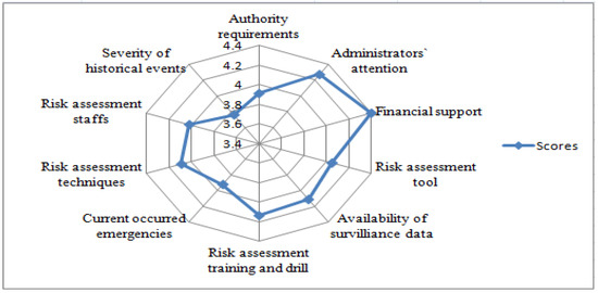 The respondents considered that there existed several factors associated with their risk assessment competencies (Figure 3). Financial support from the government was regarded as the most important factor, with the score of 4.40 ± 0.96, followed by the factor of administrators’ attention (4.27 ± 1.00). The scores of specialized training and risk assessment drills and availability of surveillance data were also more than 4.1. The other three factors including risk assessment technique, tools and methods, and workers, had the scores of 4.0. The severity of historical emergency events was deemed as a limited impact on risk assessment with the score of 3.76 ± 1.18.