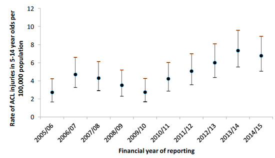 Person time rates per 100,000 population for ACL injuries admitted to hospital in Victoria amongst 5- to 14-year-olds with 95% confidence intervals.