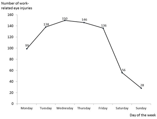 The large majority of injuries (about half) occurred during the central hours of the morning and afternoon: 9–11 and 14–16, respectively (Figure 2). The frequency of injuries from Tuesday to Friday was mainly similar, but was lower on Monday. Less injuries occurred on Saturday and Sunday, but the total number of workers at work during these days is substantially lower when compared to the other days of the week (Figure 3).