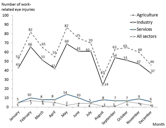 This trend suggested an analysis of the injuries which occurred in the different sectors: industry (including construction), agriculture, and services. The results are presented in Figure 4: in agriculture, the highest number occurred in February, while both in industry and services, the highest number occurred during May. The total number of events observed was too low for a more detailed evaluation, e.g., according to the causal agent.