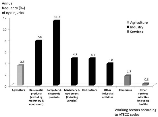 Considering the specific company activity of injured workers and classified according to the abovementioned ATECO codes, the absolute number and frequency of eye-injuries presented in Figure 5 and Table 1 confirm that metal working (including the assembling of various appliances) is the activity inducing the highest risk, followed by construction and agriculture.