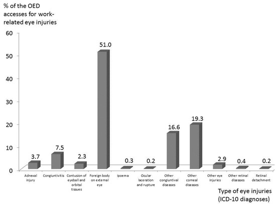Considering the diagnosis of eye injuries classified according to ICD-10 (Figure 6), our results are in agreement with another Italian study based on a similar number of annual OED accesses [6], showing that the vast majority of occupational injuries were “closed globe injuries”, representing 98.8% of the total of OED accesses, followed by “open globe injuries” (0.8%) and adnexal injuries (0.3%). In our sample closed globe injuries represented the 96.1% of the total number of OED accesses, open globe, 0.2%, and adnexal injuries, the remaining 3.7%. Comparing the types of the most frequent occupational injuries (closed globe), in our sample a foreign body was detected in 51% of the cases, which is comparable with Fea et al.’s [6] results (60.5%), as is the proportion of corneal and conjunctival injuries, while we found fewer cases of retinal diseases. Finally, Fea et al. found that foreign bodies of the external eye were more significantly represented in work-related injuries than in home injuries. As only data on occupational eye injuries were collected, no comparison with non-occupational injuries was possible; nevertheless, our interest was focused on the risk of work-related injuries, with the aim to evaluate the need of preventive measures and, possibly, to give some suggestions on interventions.