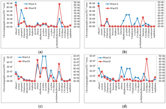 Figure 2 shows the chromatographic areas of the main molecules detected in the different places of the two wards, in order of gas-chromatographic elution time, volatility, classes of compounds, and molecular weight.