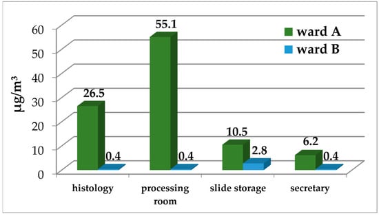 Figure 3 reports sum of benzene, toluene, ethylbenzene and xylenes (∑BTEX) concentrations measured in the different areas. Benzene levels were at the limit of quantification (LOQ) in all sites. The concentrations of toluene, ethylbenzene, and xylenes were higher in ward A than in ward B, where each compound was almost always at LOQ or below LOQ except in “slide storage”, where low concentrations of these compounds were detected.