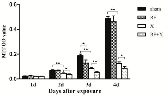 Cell proliferation level of GC-1 cells at different time points after treatment with radio-frequency (RF) and/or X-ray detected by MTT assay. Bars represent the means ± standard deviation (SD). * p < 0.05; ** p < 0.01; n ≥ 3; X: X-ray; MTT: 3-(4,5-dimethyl-2-thiazolyl)-2,5-diphenyl-2-H-tetrazolium bromide.