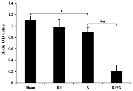 Cell proliferation level of GC-1 cells at 3d after treatment with RF and/or X-ray detected by bromodeoxyuridine (BrdU) ELISA assay. Bars represent the means ± SD. * p < 0.05; ** p < 0.01; n ≥ 3; ELISA: enzyme-linked immunosorbent assay.