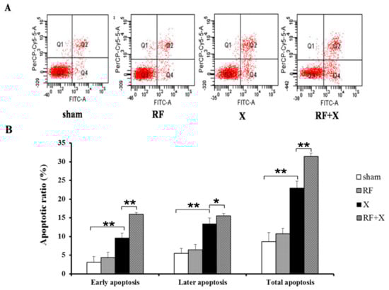 The apoptotic ratio in GC-1 cells at 3d after treatment with RF and/or X-ray, measured by Annexin V flow cytometry; * p < 0.05, ** p < 0.01; n ≥ 3; FITC-A: fluorescein isothiocyanate-A; PerCP-Cy5-5-A: peridinin chlorophyll protein-cyanine 5-5-A.