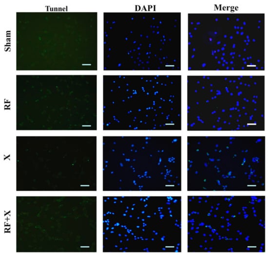 The apoptosis level in GC-1 cells at 3d after treatment with RF and/or X-ray detected by transferase-mediated deoxyuridine triphosphate-biotin nick end labeling (TUNEL) staining. TUNEL staining (green) indicates apoptotic nuclei, 4’,6-diamidino-2-phenylindole (DAPI) counterstaining (blue) indicates nuclei (Scale bar = 50 μm); Representative images were chosen.