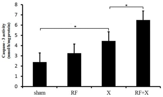 As shown in Figure 5, there was no difference in caspase-3 activity level of GC-1 cells between sham group and RF group. At 24 h after X-ray irradiation, the activity of caspase-3 increased significantly compared with the sham group (p < 0.05). Moreover, RF exposure promoted X-ray-induced caspase-3 activation, which was consistent with the results of flow cytometry and TUNEL assay.